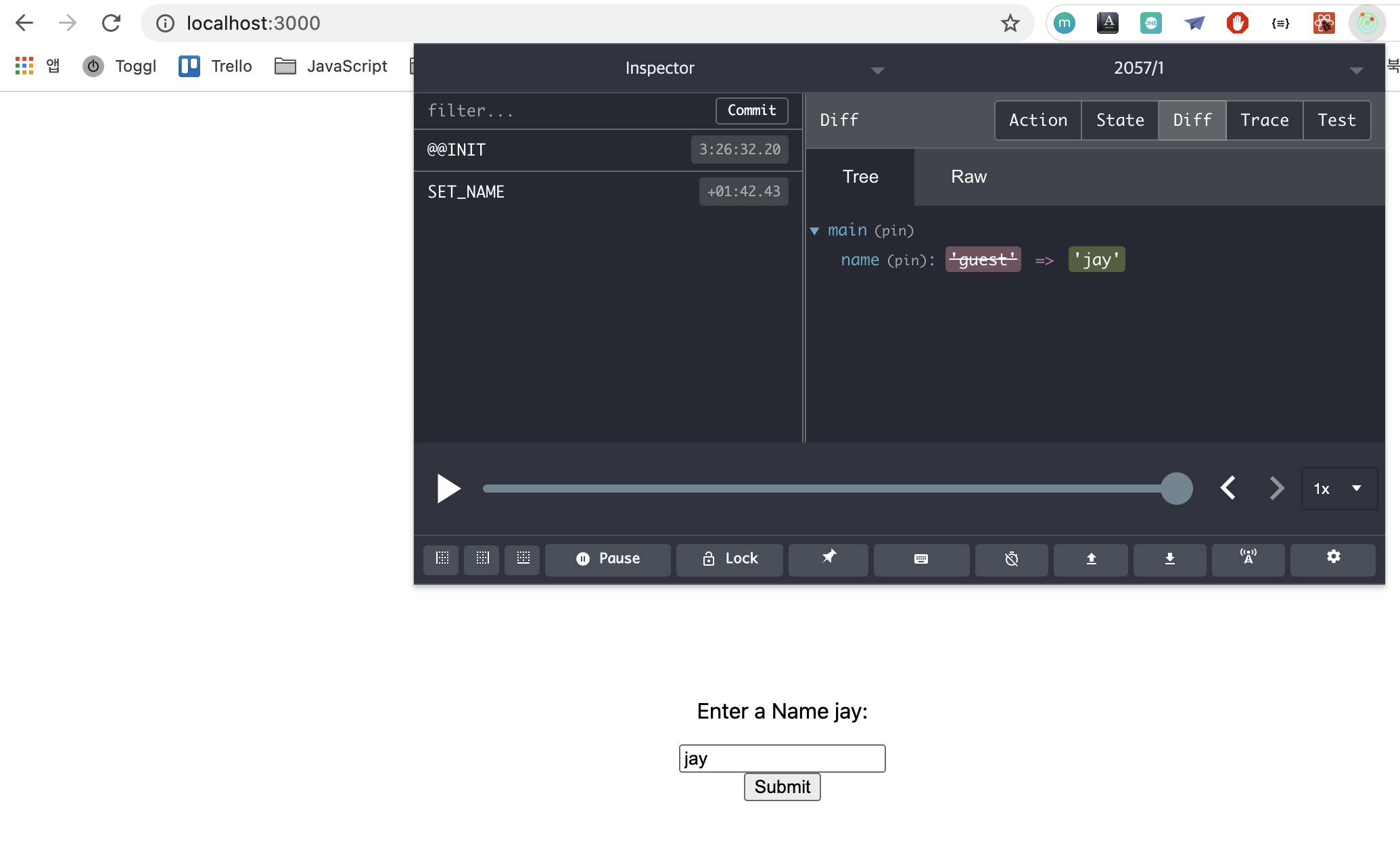 name의 값을 guest로 초기화해두었기 때문에 guest 라고 출력되는 것을 확인할 수 있습니다. 여기에 jay 라고 입력하고 submit 버튼을 클릭해보겠습니다.