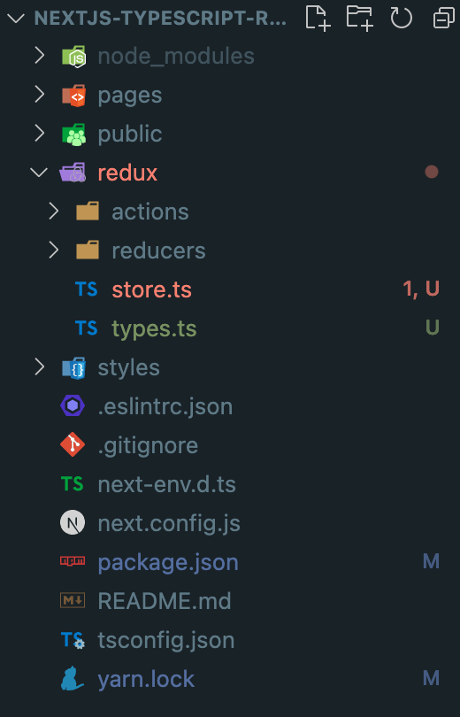 패키지 설치가 완료되었으면, 프로젝트 루트(root)에 redux라는 이름의 폴더를 생성합니다. 그리고 그 내부에 store.ts, types.ts 파일과 actions, reducers라는 이름의 폴더를 생성합니다. 아래 그림과 같이 생성되면 됩니다.