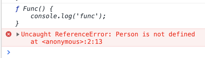 Func 함수는 출력이 되었는데, Person 클래스는 정의되지 않았다는 에러가 발생했습니다. 즉, 함수는 호이스팅되어 선언하기 전에 사용할 수 있고 클래스는 호이스팅되지 않아 반드시 선언 후에 사용해야한다는 것을 알 수 있습니다.