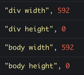 분명 width는 값이 제대로 나오는데, height는 0으로 나온 것을 확인할 수 있습니다. 이러한 값이 나오는 이유는 부모 element에게 있습니다. %를 이용하여 높이를 지정한 경우, 그 부모의 높이의 상대값으로 정해지는데, 그 부모도 높이가 없기 때문에 이러한 이슈가 발생하는 것입니다. 위 예제에서는 body의 높이가 0인것을 확인할 수 있습니다.