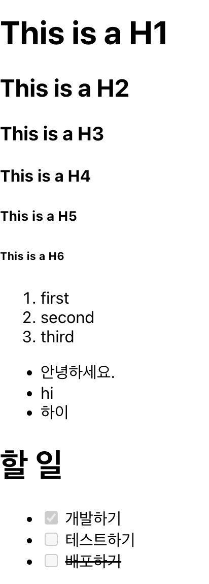 결과는 아래와 같습니다. 작업 목록과 취소선도 잘 적용된 것을 확인할 수 있습니다.